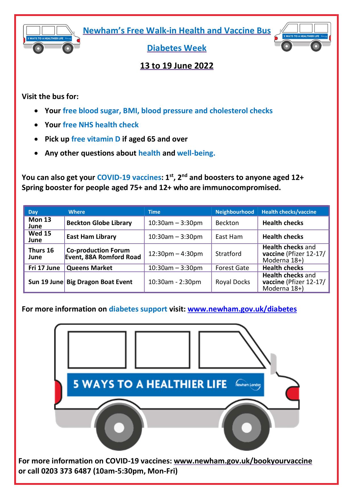 Newham Health Collaborative (NHC) will be working alongside Newham Council to offer blood sugar and BMI checks as well as blood pressure and cholesterol checks to eligible residents during Diabetes Week on the Health Bus.
