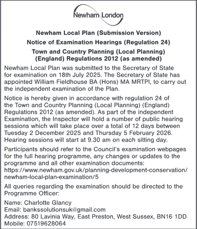 15th October 2025 - The Council has published the Public Notice in line with Regulation 24 of the Town and Country Planning (Local Planning) (England) Regulations 2012 in the Newham Recorder and to sent a copy to the Local Plan mailing list.